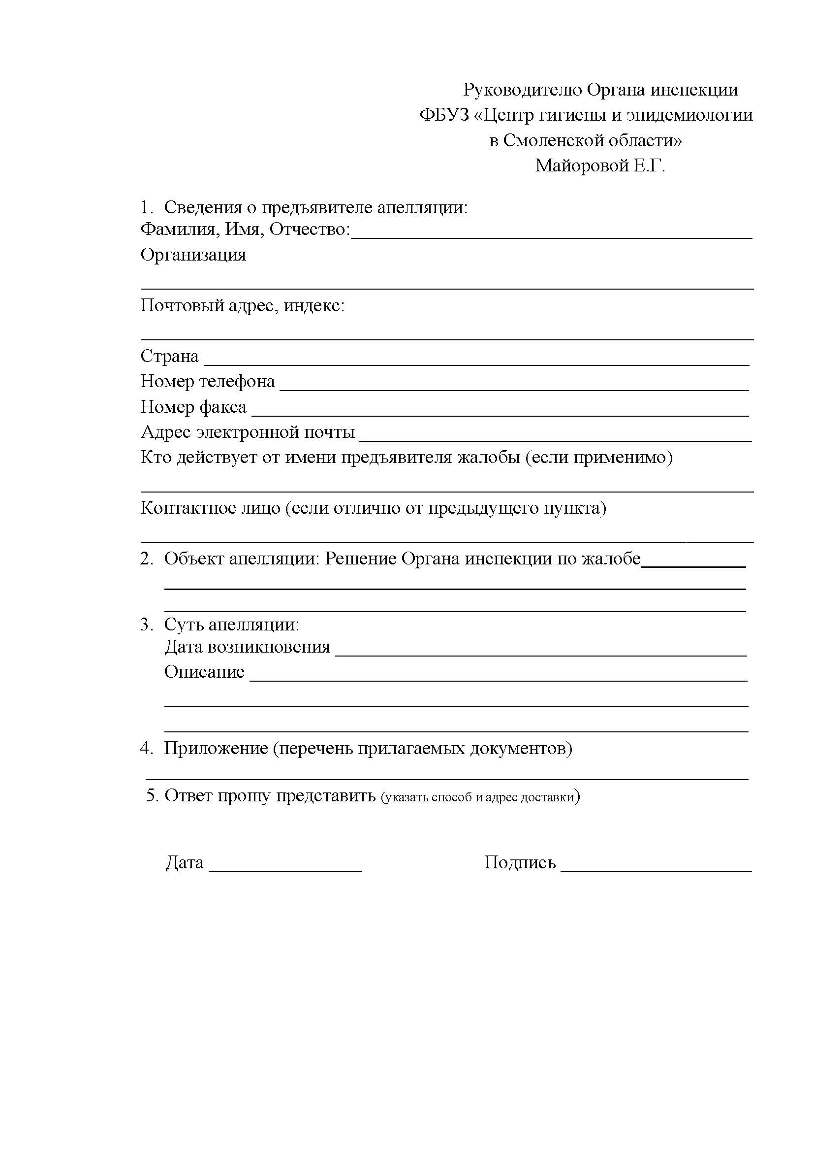 В случаях возникновения разногласий между потребителем услуг Органа инспекции (заявителем) и Органом инспекции по вопросам, касающимся качества и своевременности оказанных услуг (выполненных работ) или несогласия с решением Органа инспекции заявитель имеет право обратиться по спорным вопросам с жалобой на имя руководителя Органа инспекции. Жалоба может быть подана по почте (214013, Смоленск, Тульский пер.12), по факсу 64-28-58, на электронный адрес fbuz67@fguz-sm.ru в письменном виде по установленной форме: